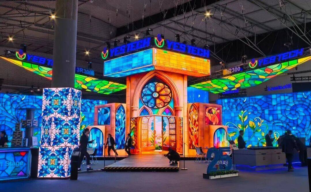 展会现场,新亚胜以“一屏通用,一屏百变”为核心主题,打造了占地300平方米、入围ISE 2026展台设计大奖赛决赛的明星展区—“YESphere”创意舞台。