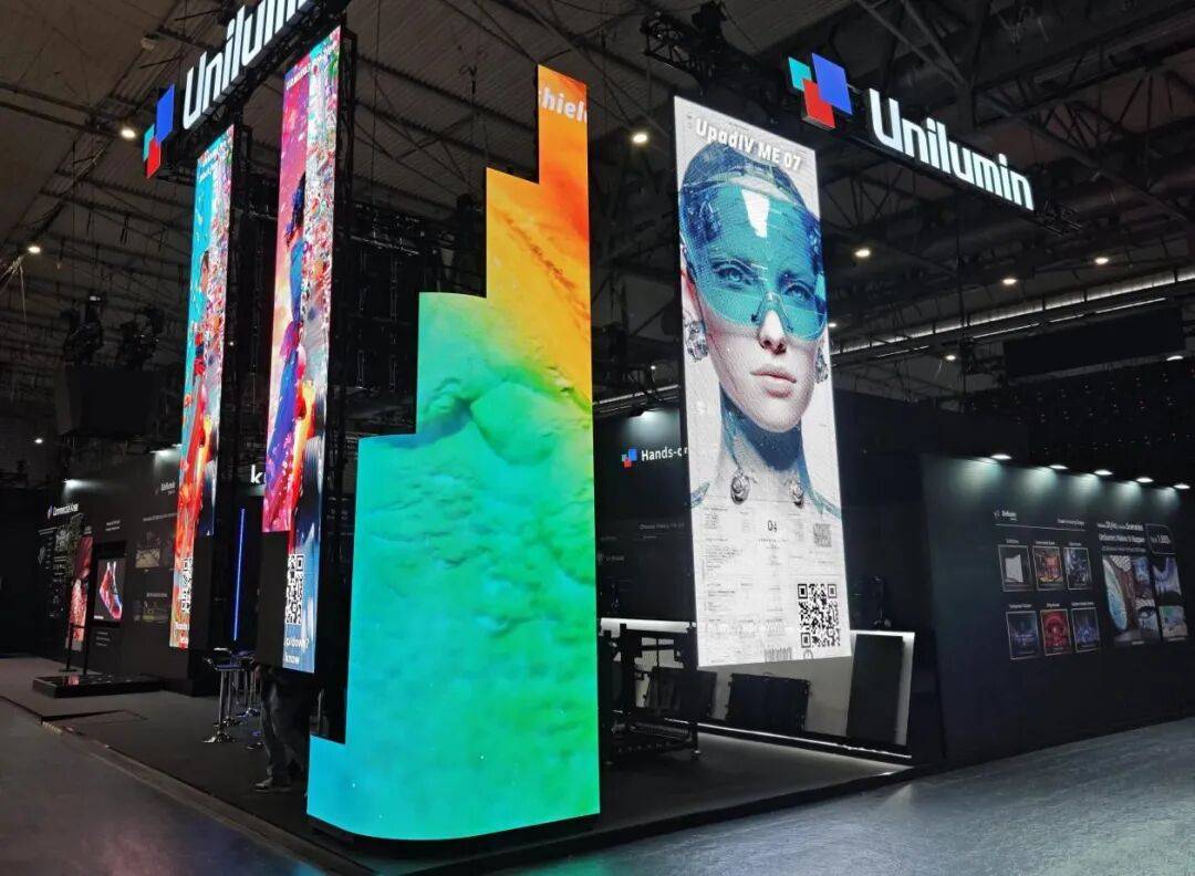 主展区3D300集中呈现了20余款领先的LED显示产品。作为展位主屏,旗舰新品—UMini5 Pro以P0.7微间距打造视觉震撼,是COB显示的集成典范。它搭载LVDS与5G传输技术,抗干扰强,符合EMC B类标准,布线更简洁;独家冷屏技术节能高达55%,大幅降低热感;无线缆高集成设计与模块级安全保护,兼顾美观与可靠;配合高性能驱动IC,实现7680Hz刷新率与21位灰度,画质细腻流畅。