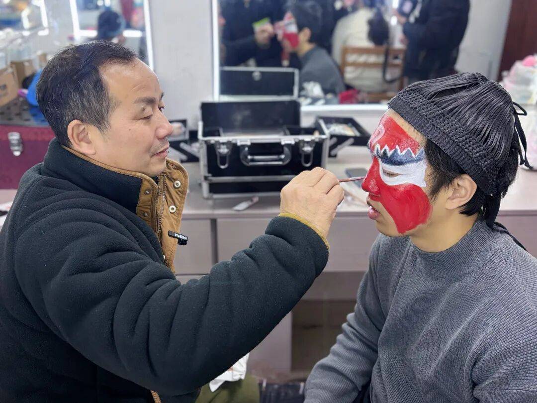 化妆间内,国家级非物质文化遗产代表性传承人唐光明正手执细笔,为青年演员连邹铭细细勾画眉眼。勒头、吊眉、贴片子、画眼描唇,一招一式、一笔一画皆循古法、尽显章法。“宜黄戏花脸妆独具一格,以黑、白、红三色为基底,三角锯齿眉、额头问号纹,每一处纹饰都与人物身份息息相关。”唐光明娓娓道来。旦角吊眉尽显秀丽温婉,红粉白油彩映衬新春喜气,上妆完毕,戏曲人物即刻鲜活有神,登台献艺更添吉祥瑞气。